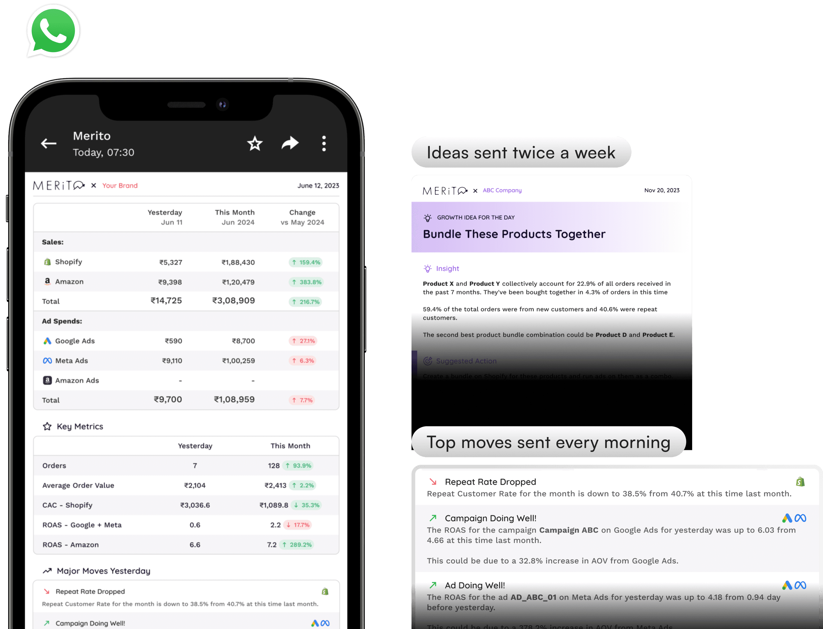 Later, when we built WhatsApp reports, we automated messages with new ideas every Monday and Thursday, and attached insights to the reports.