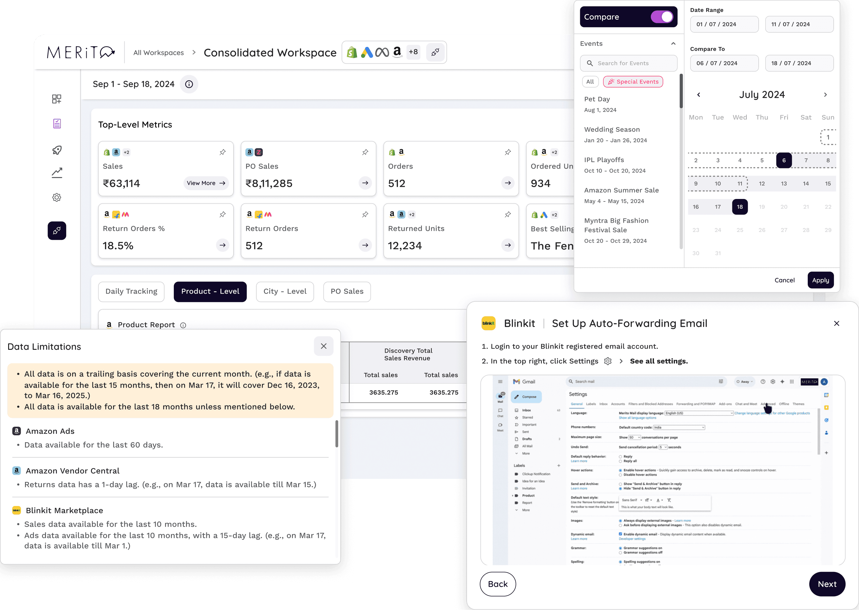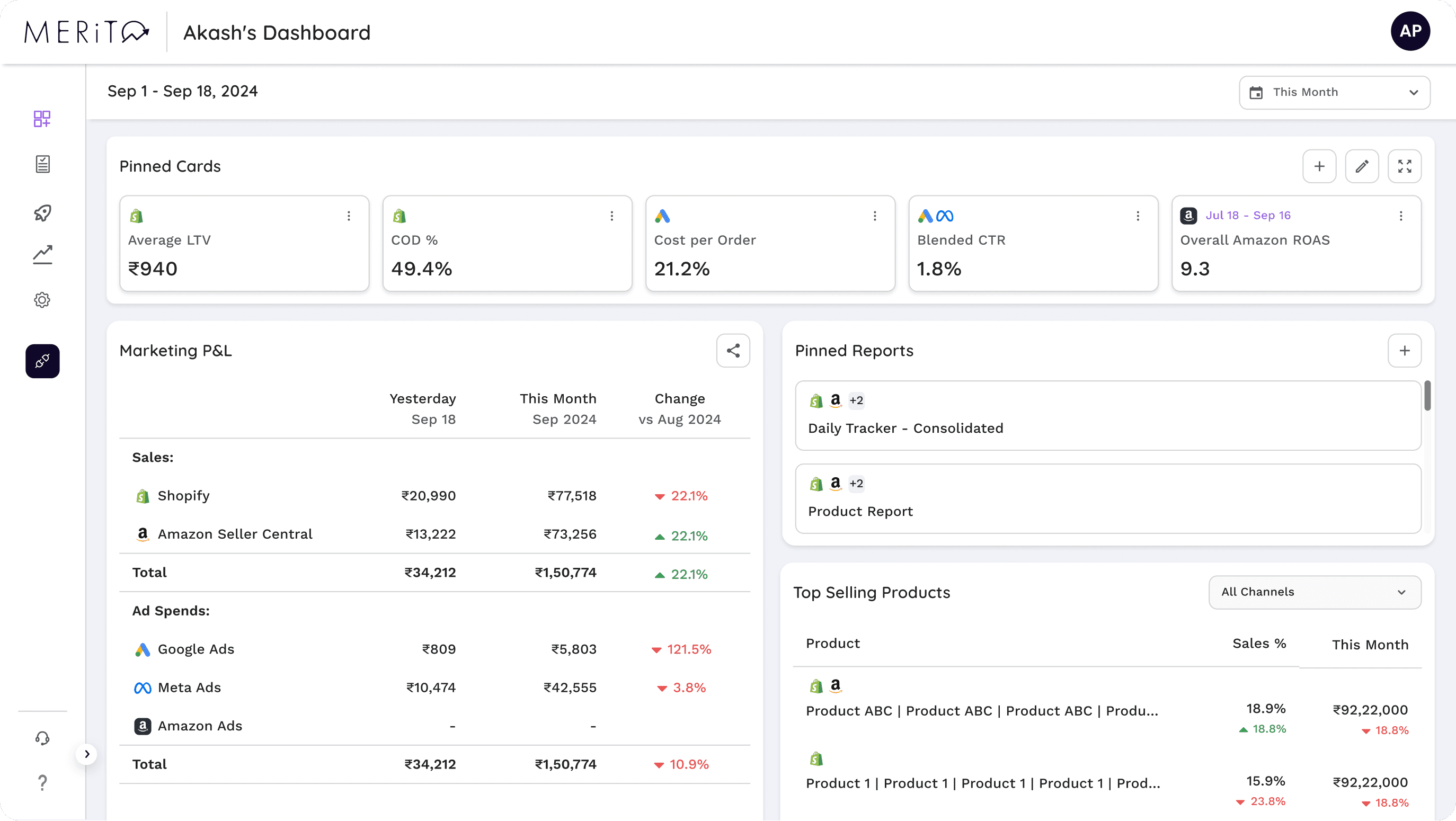 Designed three versions of the dashboard over time. Focused on helping founders see the metrics they care about by letting them pin what matters. Added simple views like a marketing P&L and top selling products for a quick snapshot across channels.