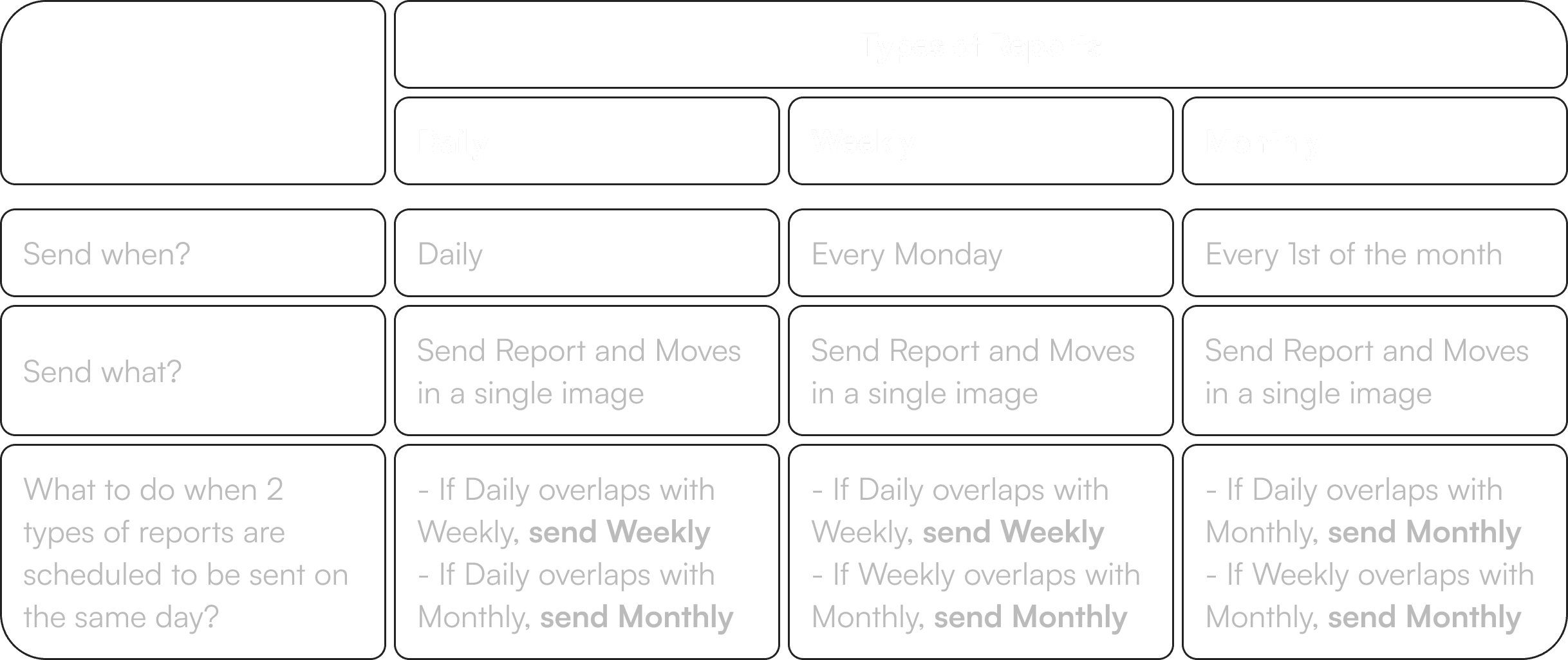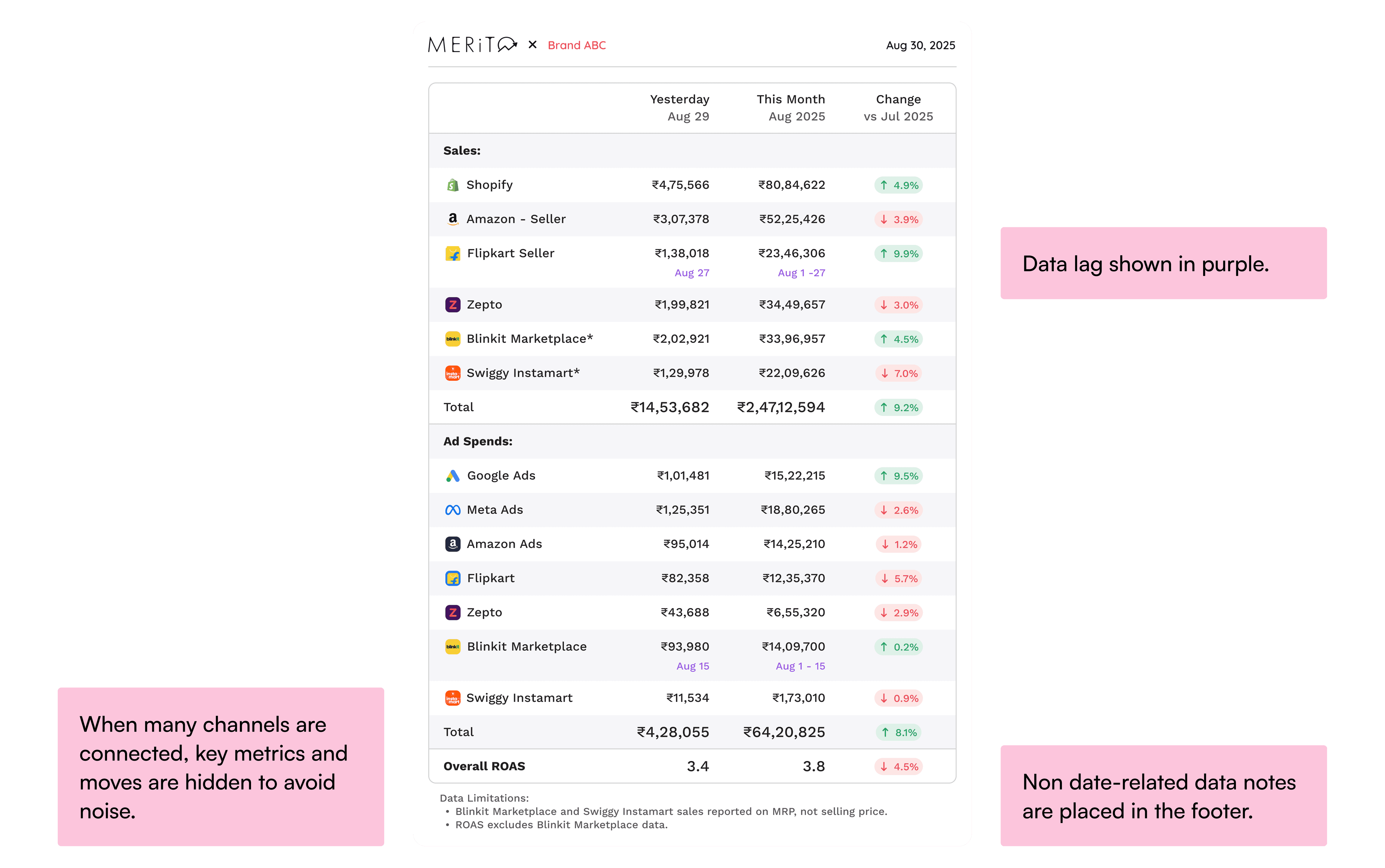 Brands cared about a fixed set of metrics. Showing them daily made sense, so we included data for yesterday, month-to-date and last month for the daily variant.